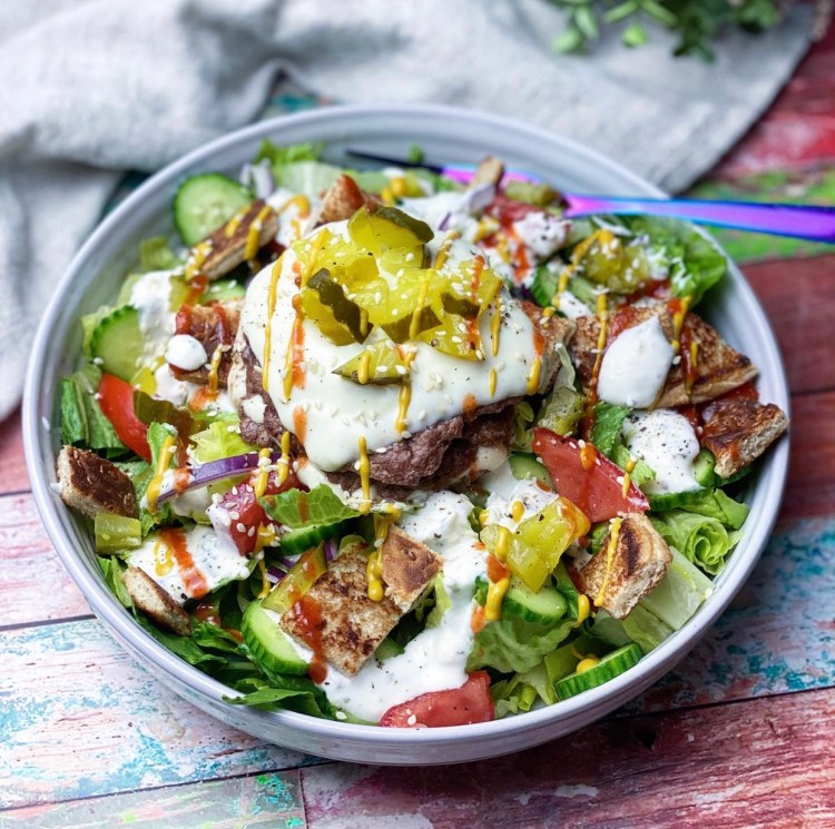 This burger salad features all of your favorite burger fixinโs , it even has burger bun croutons!