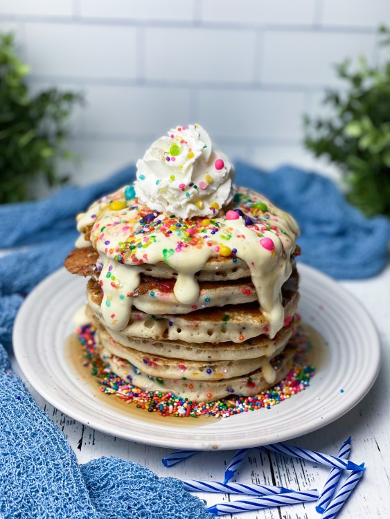 โข Garnish the pancakes with the vanilla cream cheese frosting , whipped cream and a little more sprinkles. Use syrup or not, up to you.