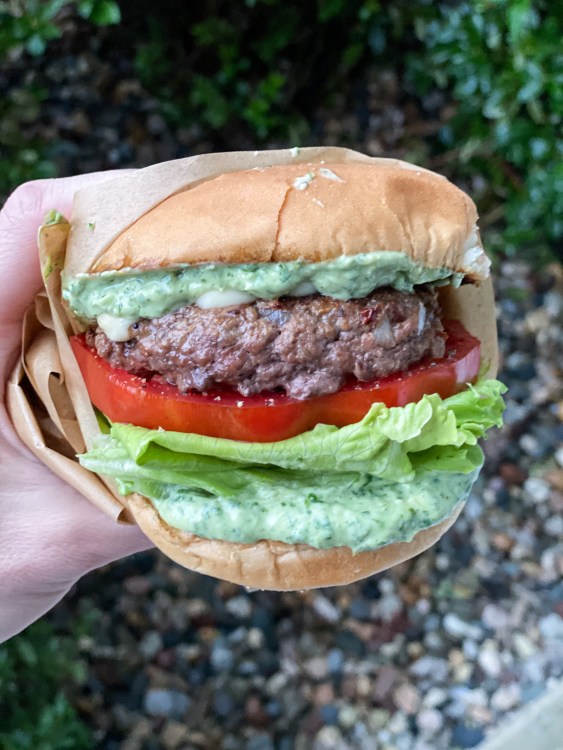 Let me just tell you about this chieeseburger! This burger was delicious and has to be one of my favorite burgers I’ve made! It has spice and super delicious with the my new crema!