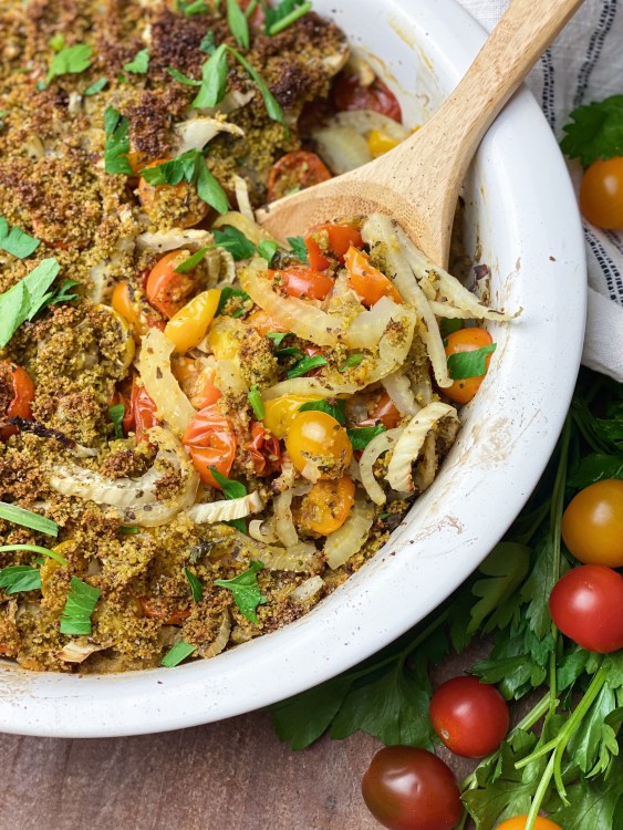 My Tomato & Fennel Gratin is the perfect side dish for any dinner or holiday. Its not only super easy to throw together its delicious. Have you ever had fennel? It has a sweet anise like flavor that pairs so well with the sweet roasted tomatoes.