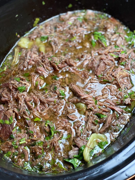 - Once 6 hours has passed, check to see if the beef easily shreds. If it does shred and add the other 1 cup of beef broth and parsley. let sit for another 30 minutes