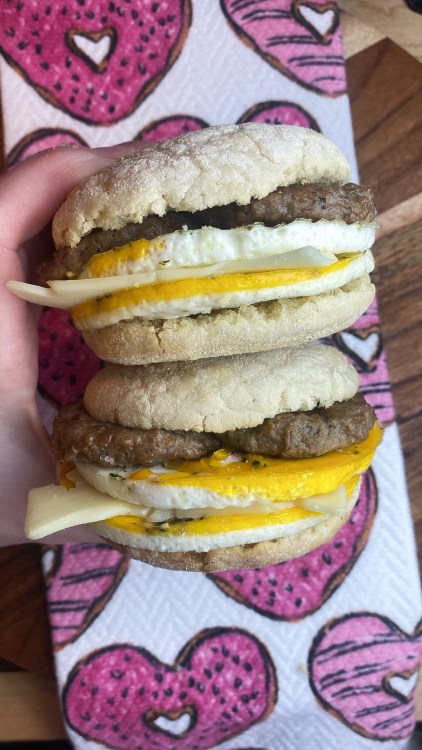 - Once eggs and english muffins are done and cooled assemble with cheese and sausages ( store in plastic wrap then foil ) and place in freeze.