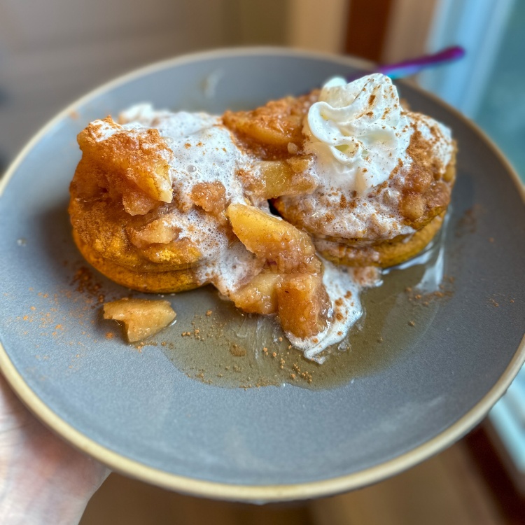 - Once pancakes are done, top with my Crockpot Cinnamon Apples , pancake syrup and some whipped cream.
