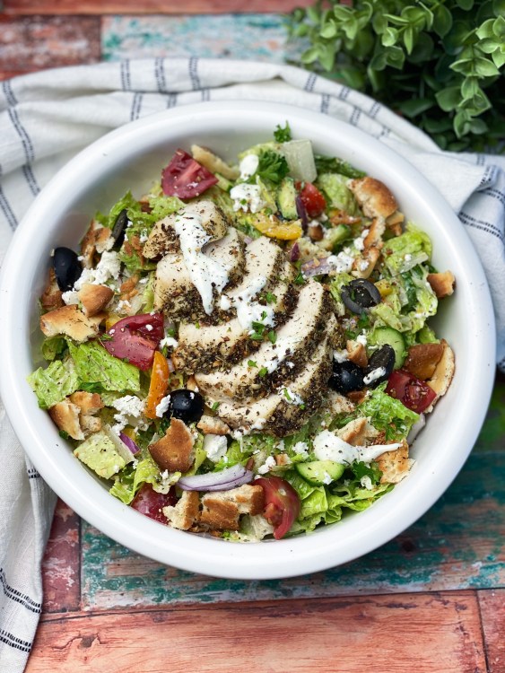 Greek Chicken Chop Salad With Herb Naan Croutons